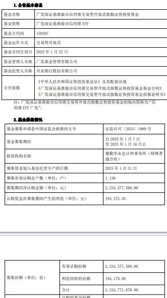 中国经济网北京1月23日讯今日,广发基金管理有限公司发布广发深证基准做市信用债交易型开放式指数证券投资基金基金合同生效公告。 募集期间净认购金额2,234,577,500.00元,认购资金在募集期间产生的利息194,372.35元,募集份额合计2,234,771,679.00份。 基金经理高翔曾在中国邮政储蓄银行股份有限公司先后任资金营运部资产管理处副处长、金融同业部理财投资处副处长、资产管理部固定收益处副处长,曾任广发基金管理有限公司债券投资部副总经理,现任广发基金基金经理。...
